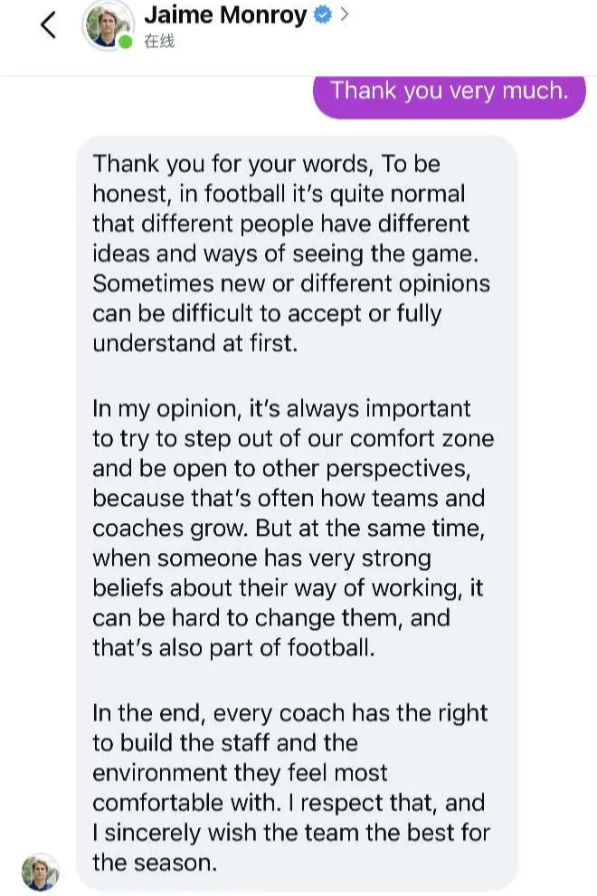 Jaime Monroy还特地如此说道:“当一个人对自己的工作方式有着非常坚定的信念时,想要改变他们会更加困难……每位教练有权组建自己最舒适的教练团队和工作环境……”因此他尊重这一点,所以无法与大连英博主教练李国旭共事。可以看出来,Jaime Monroy说的非常委婉,而他所要表达的意思就是大连英博主帅李国旭非常坚持自己的信念,很难听取助教的建议,因此他们无法合作下去。